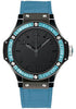 Hublot Big Bang Tutti Frutti Blue Watch 38mm black ceramic case, 18K white gold PVD bezel set with 48 blue topaz baguettes, black composite resin lateral inserts and bezel lugs, black dial, quartz HUB 2900 movement, blue rubber and gummy alligator strap with deployant buckle. Water resistant to 100 meters.