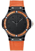 Hublot Big Bang Tutti Frutti Orange Watch 38mm black ceramic case, 18K white gold PVD bezel set with 48 orange sapphire baguettes, black composite resin lateral inserts and bezel lugs, black dial, quartz HUB 2900 movement, orange rubber and gummy alligator strap with deployant buckle. Water resistant to 100 meters.