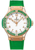 Hublot Big Bang Tutti Frutti Apple Watch38mm 18K red gold case, 18K red gold bezel set with 48 tsavorite baguettes, green composite resin lateral inserts and bezel lugs, white dial, quartz HUB 2900 movement, green rubber and gummy alligator strap with deployant buckle. Water resistant to 100 meters.
