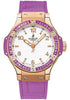 Hublot Big Bang Tutti Frutti Purple Watch 38mm 18K red gold case, 18K red gold bezel set with 48 amethyst baguettes, purple composite resin lateral inserts and bezel lugs, white dial, quartz HUB 2900 movement, purple rubber and gummy alligator strap with deployant buckle. Water resistant to 100 meters.