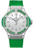 Hublot Big Bang Tutti Frutti Apple Watch 38mm stainless steel case, 18K white gold bezel set with 48 tsavorite baguettes, green composite resin lateral inserts and bezel lugs, white dial, quartz HUB 2900 movement, green rubber and gummy alligator strap with deployant buckle. Water resistant to 100 meters.