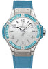 Hublot Big Bang Tutti Frutti Blue Watch 38mm stainless steel case, 18K white gold bezel set with 48 blue topaz baguettes, blue composite resin lateral inserts and bezel lugs, white dial, quartz HUB 2900 movement, blue rubber and gummy alligator strap with deployant buckle. Water resistant to 100 meters.