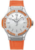 Hublot Big Bang Tutti Frutti Orange Watch 38mm stainless steel case, 18K white gold bezel set with 48 orange sapphire baguettes, orange composite resin lateral inserts and bezel lugs, white dial, quartz HUB 2900 movement, orange rubber and gummy alligator strap with deployant buckle. Water resistant to 100 meters.