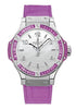 Hublot Big Bang Tutti Frutti Purple Watch 38mm stainless steel case, 18K white gold bezel set with 48 amethyst baguettes, purple composite resin lateral inserts and bezel lugs, white dial, quartz HUB 2900 movement, purple rubber and gummy alligator strap with deployant buckle. Water resistant to 100 meters.