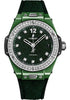 Hublot Big Bang One Click Italia Independent Dark Green Velvet Limited Edition of 100 Watch39 mm polished green ceramic case, polished stainless steel bezel set with 42 diamonds (~1.00ct and 6 H-shaped titanium screws, sapphire crystal with anti-reflective treatment, green and genuine green velvet dial set with 10 diamonds for ~0.15ct, HUB1710 self-winding movement, approximately 50 hours of power reserve, black rubber and genuine green velvet strap, stainless steel deployant buckle. Water resistant to 100 meters.