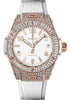 Hublot Big Bang One Click King Gold White Jewellery Watch 39 mm polished 18K King gold case set with 118 diamonds (~0.84ct), polished 18K King gold bezel polished 18k king gold set with 48 baguette-cut diamonds (~1.90cts) and 6 H-shaped titanium screws, sapphire crystal with anti-reflective treatment, mat white dial, HUB1710 self-winding movement, approximately 50 hours of power reserve, white structured lined rubber strap, 18K King gold and gold-plated titanium deployant buckle. Water resistant to 100 meters.