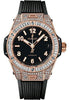 Hublot Big Bang One Click King Gold Jewellery Watch 39 mm polished 18K King gold case set with 118 diamonds (~0.84ct), polished 18K King gold bezel polished 18k king gold set with 48 baguette-cut diamonds (~1.90cts) and 6 H-shaped titanium screws, sapphire crystal with anti-reflective treatment, mat black dial, HUB1710 self-winding movement, approximately 50 hours of power reserve, black structured lined rubber strap, 18K King gold and black-plated titanium deployant buckle. Water resistant to 100 meters.