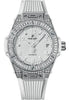 Hublot Big Bang One Click Steel White Jewellery Watch 39 mm polished stainless steel case set with 118 diamonds (~0.84ct), polished 18K white gold bezel polished 18k white gold set with 48 baguette-cut diamonds (~1.90cts) and 6 H-shaped titanium screws, sapphire crystal with anti-reflective treatment, mat white dial, HUB1710 self-winding movement, approximately 50 hours of power reserve, white structured lined rubber strap, stainless steel deployant buckle. Water resistant to 100 meters.