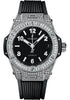 Hublot Big Bang One Click Steel Jewellery Watch 39 mm polished stainless steel case set with 118 diamonds (~0.84ct), polished 18K white gold bezel polished 18k white gold set with 48 baguette-cut diamonds (~1.90cts) and 6 H-shaped titanium screws, sapphire crystal with anti-reflective treatment, mat black dial, HUB1710 self-winding movement, approximately 50 hours of power reserve, black structured lined rubber strap, stainless steel deployant buckle. Water resistant to 100 meters.
