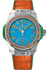 Hublot Big Bang Steel Orange Pop Art Limited Edition of 200 Watch 39 mm polished and satin-finished stainless steel case, polished stainless steel bezel set with 42 orange sapphires with 6 h-shaped titanium screws, sapphire crystal with anti-reflective treatment, mat blue dial, HUB 1710 self-winding movement, approximately 50 hours of power reserve, green and orange rubber and alligator strap with additional blue structured lined rubber straps and additional orange rubber with orange and green alligator straps, stainless steel deployant buckle. Water resistant to 100 m.