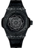 Hublot Big Bang Sang Bleu All Black Diamonds Limited Edition of 100 Watch 39 mm polished black ceramic case with engraved design by Maxime Buchi, polished black-plated bezel set with 48 black diamonds (0.70ct) with 6 H-shaped black-plated titanium screws and hexagonal decor designed by Maxime Buchi, sapphire crystal with anti-reflective treatment, mat and satin-finished black dial, HUB1710 self-winding movement, approximately 50 hours of power reserve, black rubber and shiny calf embossed design by Maxime Buchi strap, black-plated stainless steel deployant buckle. Water resistant to 100 meters.
