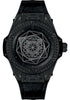 Hublot Big Bang Sang Bleu All Black Pav Watch 39 mm polished black-plated case set with 180 black diamonds (0.45ct) and with engraved design by Maxime Buchi, polished black-plated bezel set with 96 black diamonds (1.00ct) with 6 H-shaped black-plated titanium screws and hexagonal decor designed by Maxime Buchi, sapphire crystal with anti-reflective treatment, mat and satin-finished black dial, HUB1710 self-winding movement, approximately 50 hours of power reserve, black rubber and shiny calf embossed design by Maxime Buchi strap, black-plated stainless steel deployant buckle. Water resistant to 100 meters.