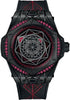 Hublot Big Bang Sang Bleu All Black Red Limited Edition of 100 Watch 39 mm polished black ceramic case with engraved design by Maxime Buchi, polished black-plated bezel set with 48 rubies with 6 H-shaped black-plated titanium screws and hexagonal decor designed by Maxime Buchi, sapphire crystal with anti-reflective treatment, mat and satin-finished black dial, HUB1710 self-winding movement, approximately 50 hours of power reserve, black rubber and calf with red embossed design by Maxime Buchi strap, black-plated stainless steel deployant buckle. Water resistant to 100 meters.
