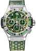 Hublot Big Bang Boa Bang Limited Edition of 250 Watch 41mm polished and satin-finish stainless steel case, polished 18K white gold bezel set with 48 fine precious baguette of tsavorite, tourmaline, and light-green sapphire, black composite resin lateral inserts and bezel lugs, green Boa Bang color dial with 8 diamond hour markers (0.14ct), self winding HUB 4300 movement with chronograph function, approximately 42 hours of power reserve, black rubber and green Boa color jeans strap with deployant buckle. Water resistant to 100 meters.