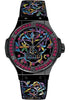 Hublot Big Bang Broderie Sugar Skull Ceramic Limited Edition of 200 Watch 41 mm polished black ceramic case, polished black-plated bezel set with 36 red spinels, sapphire crystal with anti-reflective treatment, combination of carbon fiber and multicolored embroidery dial set with 12 red spinels, HUB 1110 self-winding movement, approximately 42 hours of power reserve, black rubber and silk strap with multicolored embroidery, black-plated stainless steel deployant buckle. Water resistant to 100 m.