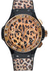 Hublot Big Bang Leopard Watch 41mm black ceramic case, 18K red gold bezel set with 48 baguette citrine, black composite resin lateral inserts and bezel lugs, Leopard print dial with 8 diamond hour markers (0.055ct), self winding HUB 4300 movement with chronograph function, approximately 42 hours of power reserve, Leopard print denim stitched into black rubber strap, deployant buckle. Water resistant to 100 meters.