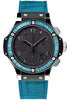 41mm black ceramic case, 18K white gold PVD bezel set with 48 blue topaz baguettes, black composite resin lateral inserts and bezel lugs, black dial, self winding HUB 4300 movement with chronograph function, approximately 42 hours of power reserve, blue rubber and gummy alligator strap with deployant buckle. Water resistant to 100 meters.