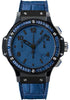 41mm black ceramic case, 18K white gold black PVD bezel set with 48 blue sapphire baguettes, blue composite resin lateral inserts and bezel lugs, mat blue dial, self winding HUB 4300 movement with chronograph function, approximately 42 hours of power reserve, dark blue rubber and gummy alligator strap with deployant buckle. Water resistant to 100 meters.