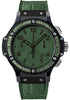 41mm black ceramic case, 18K white gold black PVD bezel set with 48 green sapphire baguettes, green composite resin lateral inserts and bezel lugs, mat green dial, self winding HUB 4300 movement with chronograph function, approximately 42 hours of power reserve, dark green rubber and gummy alligator strap with deployant buckle. Water resistant to 100 meters.