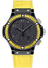 41mm black ceramic case, PVD white gold bezel set with 48 baguette yellow sapphires, matt black dial, self winding HUB 4300 movement with chronograph function, approximately 42 hours of power reserve, yellow rubber-alligator strap with deployant buckle. Water resistant to 100 meters.