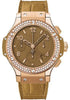 41mm 18K red gold case, 18K red gold bezel set with 114 diamonds (1.22 ct), camel composite resin lateral inserts and bezel lugs, mat camel dial, self winding HUB 4300 movement with chronograph function, approximately 42 hours of power reserve, camel rubber and gummy alligator strap with deployant buckle. Water resistant to 100 meters.
