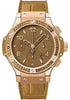 41mm 18K red gold case, 18K red gold bezel set with 48 andalusite baguettes, camel composite resin lateral inserts and bezel lugs, mat camel dial, self winding HUB 4300 movement with chronograph function, approximately 42 hours of power reserve, camel rubber and gummy alligator strap with deployant buckle. Water resistant to 100 meters.