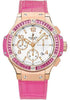 41mm 18K red gold case, 18K pink gold bezel set with 48 pink sapphire baguettes, pink composite resin lateral inserts and bezel lugs, white dial, self winding HUB 4300 movement with chronograph function, approximately 42 hours of power reserve, pink rubber and gummy alligator strap with deployant buckle. Water resistant to 100 meters