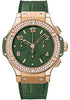 41mm 18K red gold case, 18K red gold bezel set with 114 diamonds (1.22 ct), green composite resin lateral inserts and bezel lugs, mat green dial, self winding HUB 4300 movement with chronograph function, approximately 42 hours of power reserve, dark green rubber and gummy alligator strap with deployant buckle. Water resistant to 100 meters.