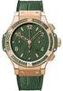 41mm 18K red gold case, 18K red gold bezel set with 48 green sapphire baguettes, green composite resin lateral inserts and bezel lugs, mat green dial, self winding HUB 4300 movement with chronograph function, approximately 42 hours of power reserve, dark green rubber and gummy alligator strap with deployant buckle. Water resistant to 100 meters.