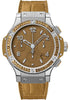 41mm stainless steel case, stainless steel bezel set with 48 andalusite baguettes, camel composite resin lateral inserts and bezel lugs, mat camel dial, self winding HUB 4300 movement with chronograph function, approximately 42 hours of power reserve, camel rubber and gummy alligator strap with deployant buckle. Water resistant to 100 meters.