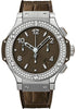 41mm stainless steel case, stainless steel bezel set with 114 diamonds (1.22 ct), brown composite resin lateral inserts and bezel lugs, mat brown dial, self winding HUB 4300 movement with chronograph function, approximately 42 hours of power reserve, brown rubber and gummy alligator strap with deployant buckle. Water resistant to 100 meters.