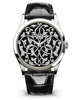 Platinum. Calatrava wristwatch with hand-engraved and enameled dial. Sapphire crystal case back. Water-resistant to 30 m. Diameter: 38 mm. Height: 8.3 mm. |