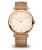 Rose gold. Sapphire crystal case back. Water-resistant to 30 m. Diameter: 34.6 mm. Height: 7.37 mm. |