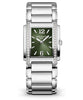 The refined and contemporary new olive green dial strikes an optimal contrast with the applied 12 and 6 o’clock numerals, the applied trapeze-shaped hour markers and the rounded baton-style hands. The original shape of the curvaceous Art Deco-inspired two-tier case is accentuated by a row of 18 diamonds set on either side of the dial.