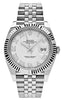 The Rolex Datejust is designed with a 41mm stainless steel case, highlighted with Rolexs' signature fluted bezel in white gold. It features a luminous white dial surrounded by roman numerals and date display at 3 o'clock, protected by a scratch-resistant sapphire-crystal. On the wrist, the stainless steel jubilee bracelet is a true beauty.