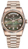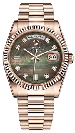 The Oyster Perpetual Day-Date is inlaid in a sophisticated 36mm 18k rose gold case surrounding a black mother of pearl dial set with diamonds in 18 ct gold settings and baguette-cut diamonds at 6 and 9 o'clock. The signature fluted bezel is an aesthetic element and distinctive feature for the Rolex brand. The symbolic 18k rose gold presidential bracelet includes semi-circular three-piece links and concealed Crownclasp.