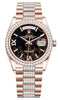 The Oyster Perpetual Day-Date is inlaid in a sophisticated 36mm 18k rose gold case surrounding an eisenkiesel designed dial with hour markers in 18 ct gold set with 32 diamonds, Roman VI and IX in 18 ct gold set with 24 diamonds. The bezel is exquisitely set with diamonds. The symbolic 18k rose gold presidential bracelet is diamond-set and includes semi-circular three-piece links and concealed Crownclasp.