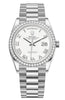 The Oyster Perpetual Day-Date is inlaid in a 36mm 18k white gold case surrounding a white dial with white gold roman numerals markers and hands. The bezel is exquisitely set with diamonds. The symbolic 18k white gold presidential bracelet includes semi-circular three-piece links and a concealed Crown-clasp.
