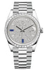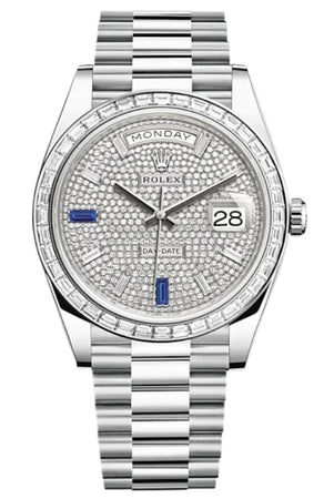 The Oyster Perpetual Day-Date is inlaid in a 40mm platinum case surrounding a diamond dial set with 8 baguette-cut diamonds and 2 baguette-cut sapphires at 6 and 9 o'clock. The bezel is also set with sparkling baguette diamonds, protected by a sapphire-crystal. The symbolic Platinum presidential bracelet includes semi-circular three-piece links and concealed crown-clasp.