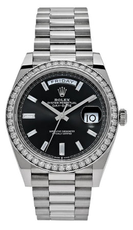 The Rolex Presidential Day-Date is inlaid in a 40mm 18ct white gold case. Designed with a rich black dial set with 10 baguette-cut diamonds, scratch-proof sapphire crystal, diamond bezel and automatic movement. The signature Presidential bracelet includes semi-circular three-piece links and embodies excellence and charm.