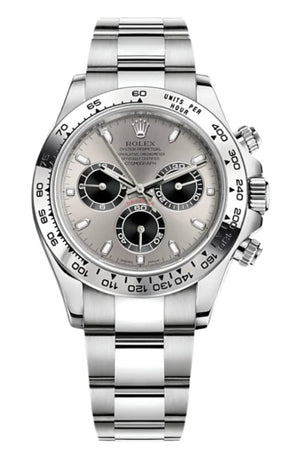 This Rolex Daytona is designed in a 40mm 18-carat white gold case, it features a steel dial with black snailed counters and 18 ct gold applique hour markers. The second hand allows accurate reading, while the two counters on the dial display the elapsed time and hours. This beauty is housed on an 18ct white gold Oyster bracelet with Oysterlock folding-clasp.
