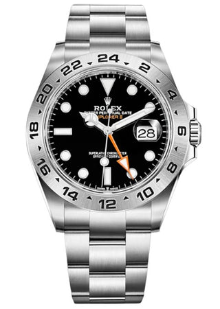 The Rolex Explorer is crafted in a 42mm stainless steel case that features a rich black dial with arrow-shaped 24-hour hand and hour markers in Chromalight. The Explorer II is equipped with a smooth bezel and 24-hour graduations, a date display, and the ability to distinguish day from night. The watch comes on an opulent stainless steel bracelet with a folding clasp.