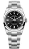 The Rolex Oyster Perpetual is designed with new ranges and vivid colors that features excellent chronometric precision, a waterproof Oyster case, and self-winding of the movement via a bidirectional Perpetual rotor. This timepiece is crafted in a 36mm polished Oystersteel case and a distinctive black dial surrounded by luminous white hour markers and a smooth domed bezel. It is housed on a polished Oyster bracelet with flat three-piece links and folding oysterclasp.