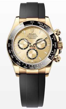 This Oyster Perpetual Cosmograph Daytona 40m in 18 kt yellow gold with a golden dial and an Oysterflex bracelet, features a black Cerachrom bezel with tachymetric scale.