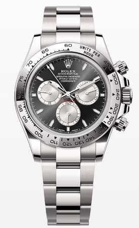 This Oyster Perpetual Cosmograph Daytona in 18 kt white gold, with a bright black and steel dial and an Oyster bracelet, features an 18 kt white gold bezel with an engraved tachymetric scale.