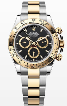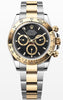 This Oyster Perpetual Cosmograph Daytona in Oystersteel and yellow gold, with a black dial and an Oyster bracelet, features a yellow gold bezel with an engraved tachymetric scale.