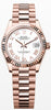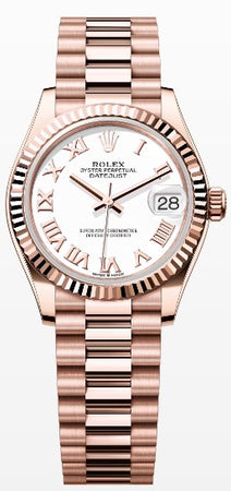 This Oyster Perpetual Datejust 31 in 18 kt Everose gold features a white dial and a President bracelet.
