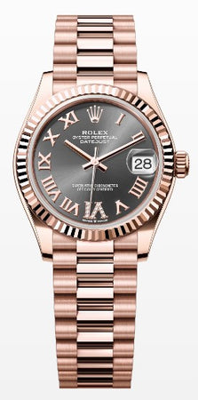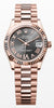 This Oyster Perpetual Datejust 31 in 18 kt Everose gold features a slate, diamond-set dial and a President bracelet.
