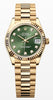 This Oyster Perpetual Datejust 31 in 18 kt yellow gold features an olive-green, diamond-set dial and a President bracelet.