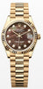 This Oyster Perpetual Datejust 31 in 18 kt yellow gold features a black mother-of-pearl, diamond-set dial and a President bracelet.